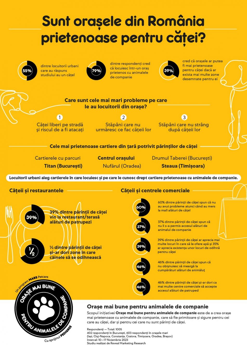La restaurant, la mall sau în clădiri publice. De multe ori, oamenii nu sunt siguri dacă au sau nu voie alături de cățel și care sunt regulile. Inițiativa Orașe mai bune pentru animalele de companie își propune să inspire părinții de câini, dar și reprezentanții companiilor și afacerilor mici să construiască un mediu prietenos cu animalele de companie, care să fie pozitiv pentru toți oamenii, indiferent dacă au sau nu căței. „În ciuda faptului că mulți dintre locuitorii din mediul urban din România au menționat că locuiesc în orașe prietenoase cu animalele, considerăm în continuare că mai avem lucruri de îmbunătățit,” spune Daniela Hlaváčková, Marketing Director Mars pentru regiunea Europa Centrală. „Un exemplu este marcarea restaurantelor sau clădirilor ca spații pet-friendly. Mulți părinți de căței nu își aduc animăluțul în astfel de spații (peste 50%) și 35% își doresc zone speciale unde le pot oferi apă câinilor. La Mars, avem în plan continuarea inițiativei prin care să inspirăm afacerile din orașe să accepte accesul alături de căței.” a adăugat Daniela Hlaváčková, Marketing Director Mars pentru regiunea Europa Centrală.